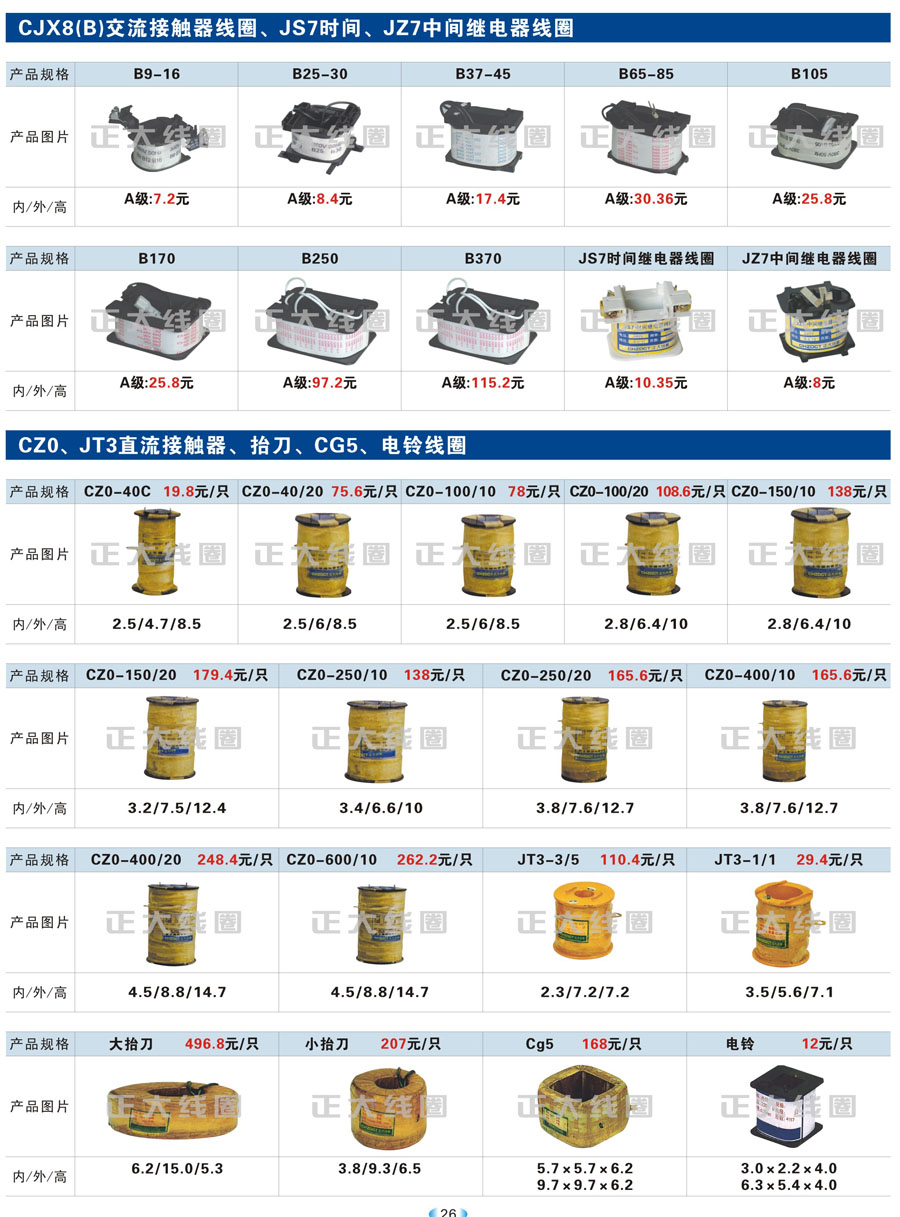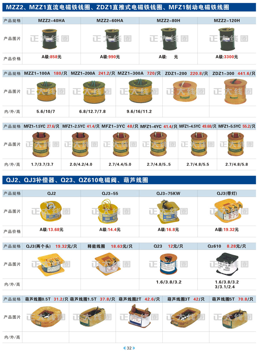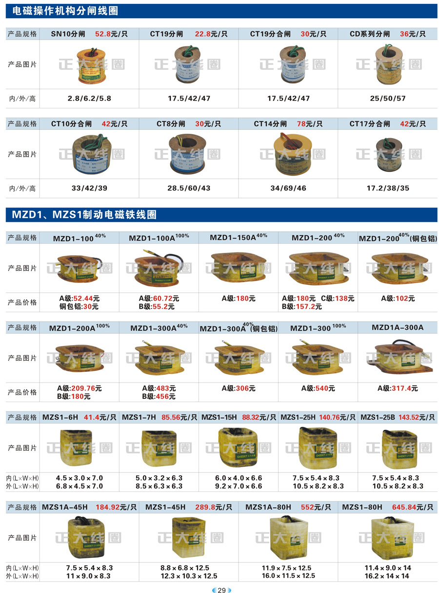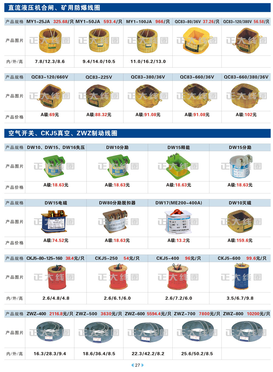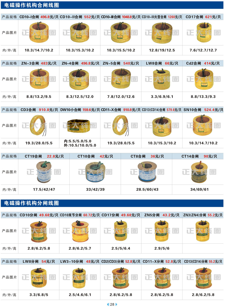 1.1 线圈作为频繁接通和切断电动机或其它负载主电路的切换电器,主要应用于接触器、继电器、操作机构、电磁铁等开关。我公司现生产CJT1、CJ12、CJ20、CJ15、3TB、3TF、LC1、CKJ5、MZD1、MZS1、MQ1、MQ2、MFJ1、MZZ1、ZDZ1、YCT、DZ系列等线圈,目前是线圈同行业领先企业。